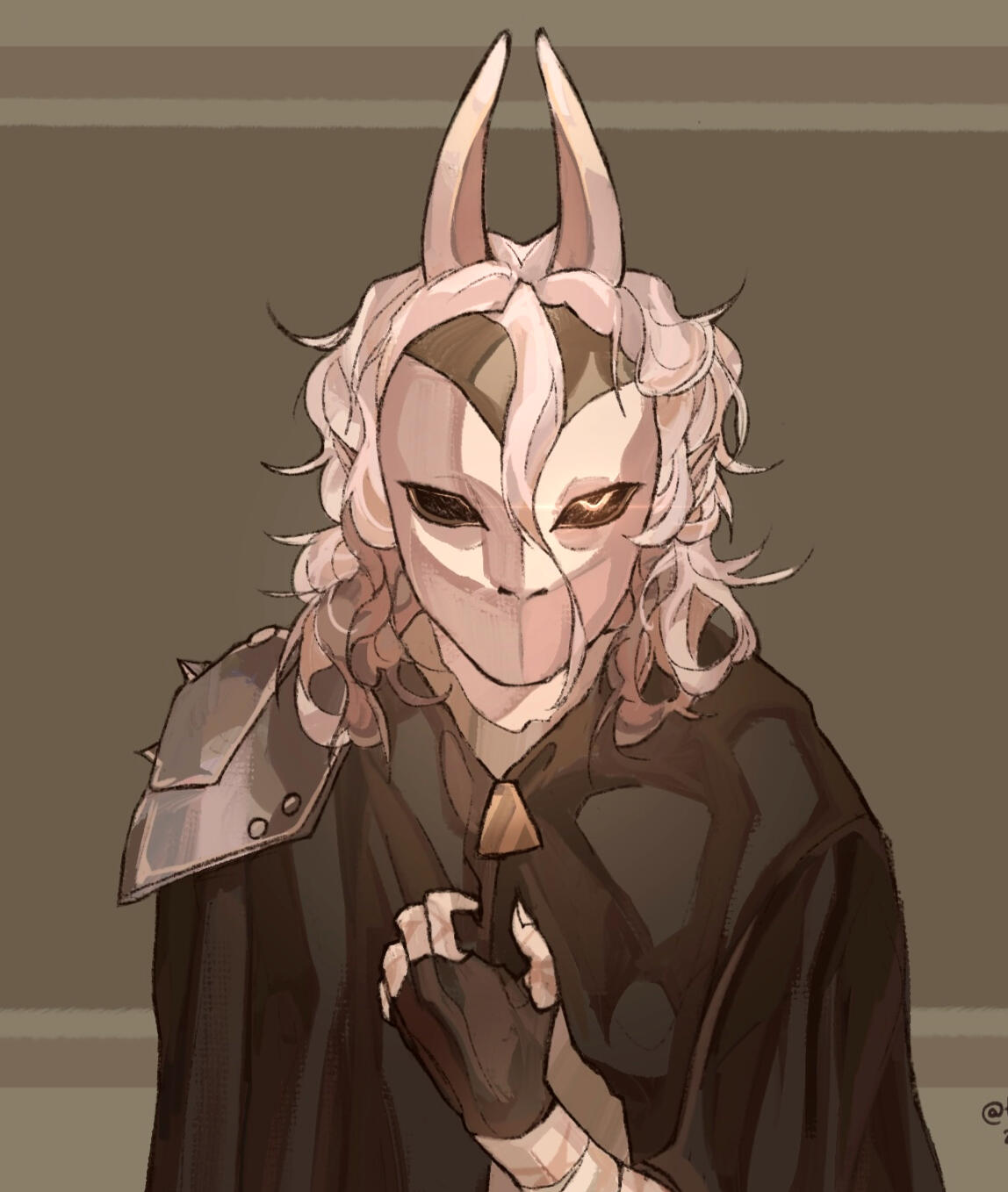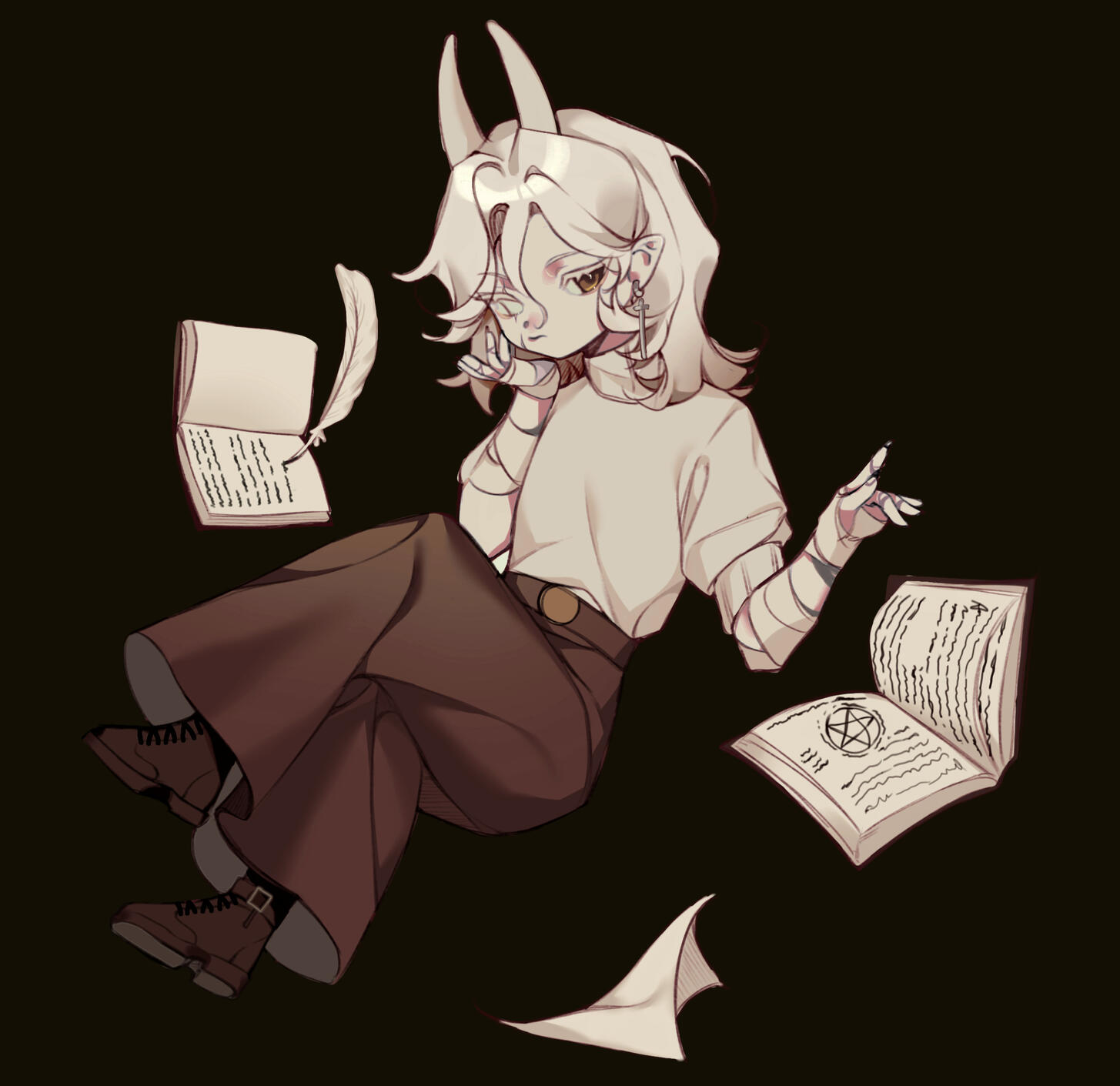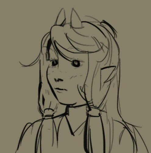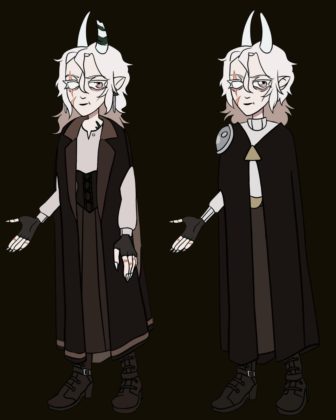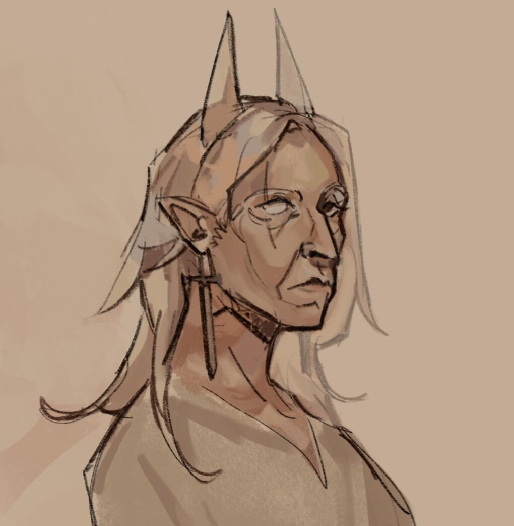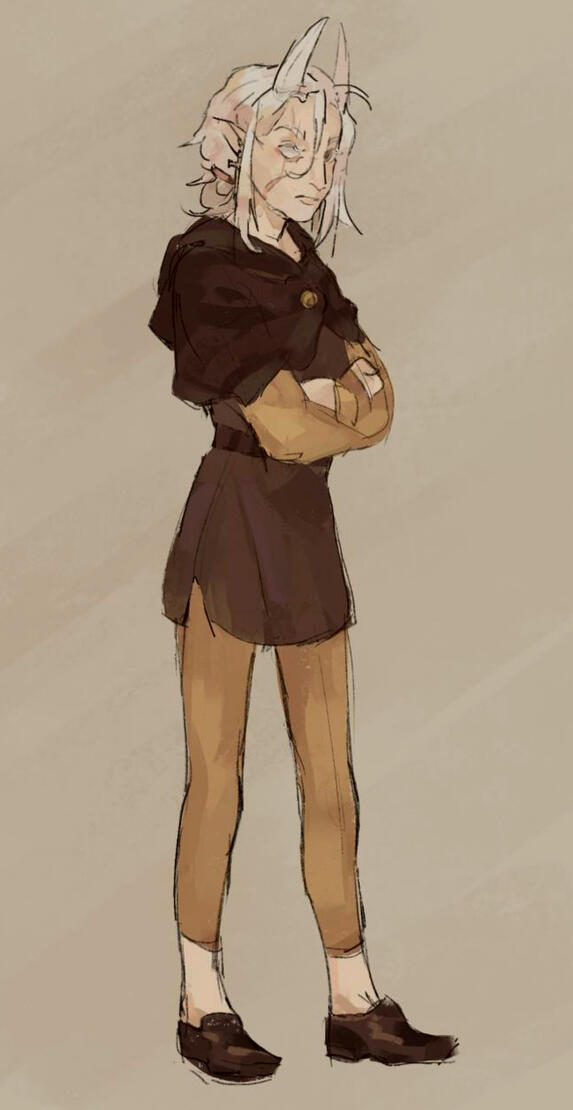 > A scar bisects Halldis's right eye, another slashes across her right cheek. The first dates from her childhood, the second from her time with the Coven, as are the scars that mark her forearms.> Halldis' hair is entirely white — lashes and brows included — except for the lower portion, dyed a light brown, a ritualistic habit retained from her youth.> Her skin is pale, a shade darker than her hair, and her head is crowned with white, goat-like horns.> Salient features: A sharp nose, high cheekbones, and thin lips.> Left eye color: brown.> Build: wiry, rangy.> Voice: calm, firm, and dry, devoid of emotion, with a faint, rustling undercurrent.